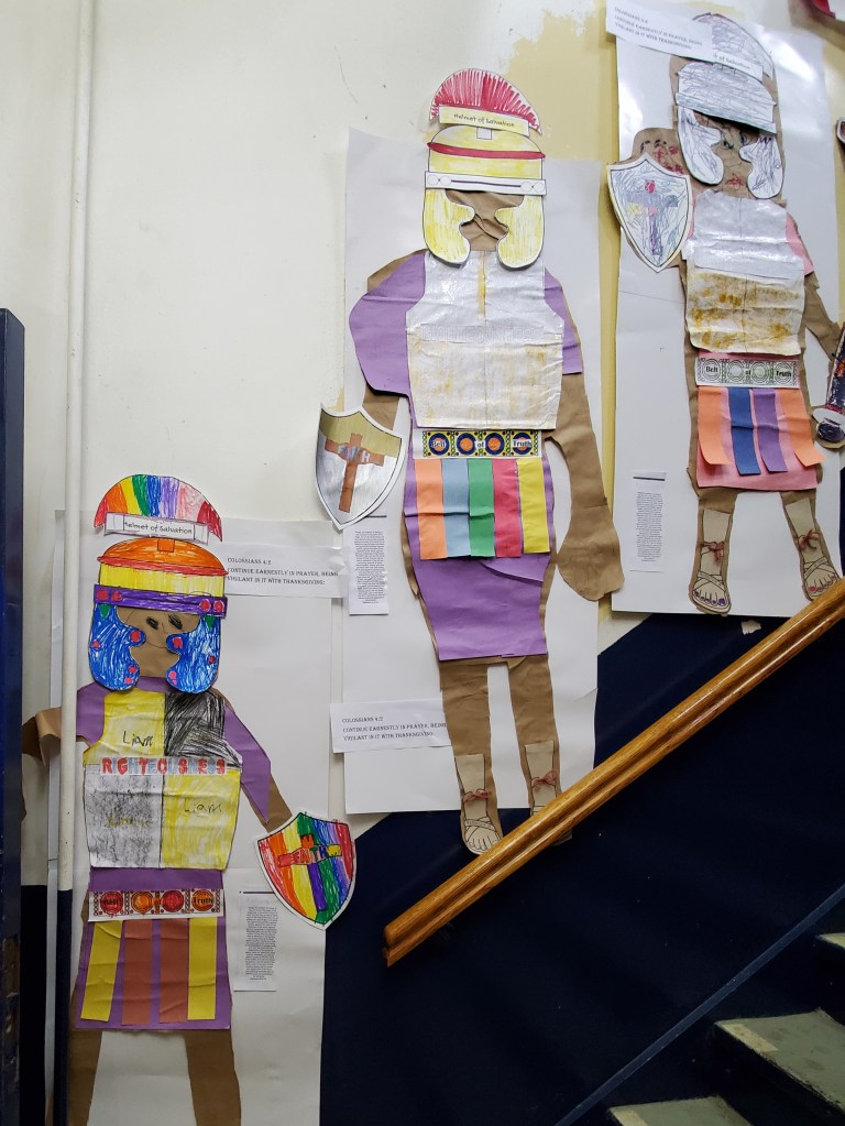 I love to teach thematically and have covered several themes such as The Armor of God, Fruit of the Spirit, the Lord’s Prayer, and currently the entire book of Proverbs. While teaching Proverbs, I have been unable to find a children’s church curriculum that teaches every chapter which became the impetus for this website. In the Proverbs section I will share my journey through teaching Proverbs with the changes I have made along the way. Eventually I hope to also share some successful themes from the past. Below are our finished projects for the Armor of God. We used them for decorations during our Roman themed VBS in 2021.