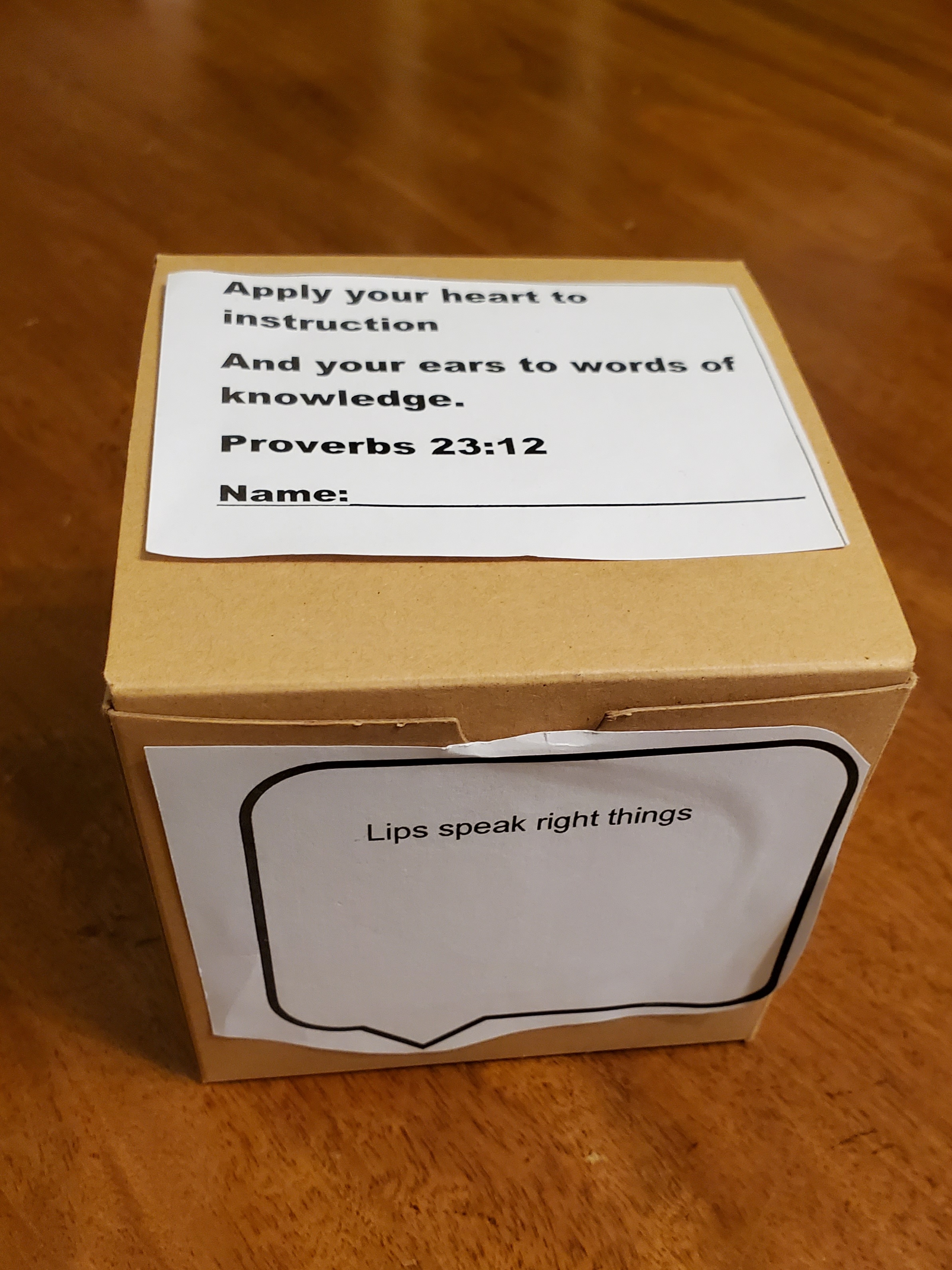 For every child print one each of craft 1 and 2 templates, plus 2 of craft 3. Cut out the shapes before class, along with strips of actions in craft 3 template. Place 2 sets of strips in a sandwich bag and give to each child when the craft is completed. If the children are young, assemble the boxes before class as well. The children will color in each symbol and glue to the box. Write their name and place the verse on the top of the box. This craft is a reminder to apply their heart to instruction throughout the week. Each time they read the Bible or do one of the actions on the strip, they take it out of the sandwich bag and place it in the box. There is a blank strip if they do something special that they would like to add. Encourage them to place the box in a location at home where they will be reminded to gain wisdom and knowledge throughout the week.